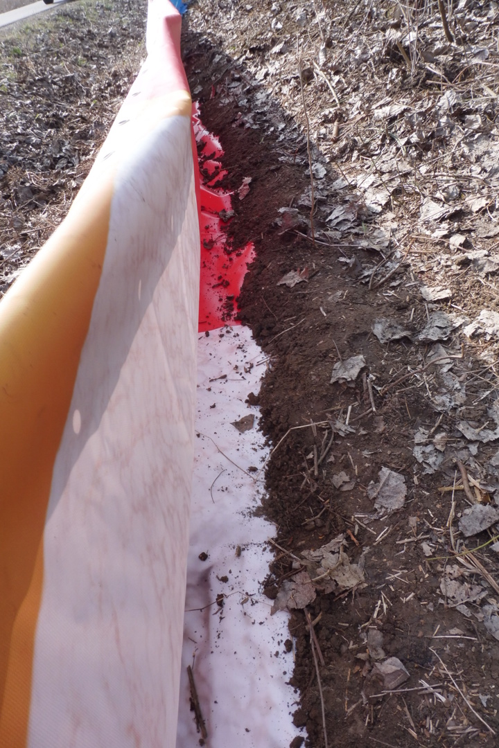 A molinók körülbelül 30-40 centiméteres sávját az elegyengetett talajra fektettük és egy körülbelül 15 centiméteres sávban talajjal takartuk. A talajtakarás célja az, hogy a mentendő állatok ne tudjanak átmászni a molinó alatt, a fal mögött rekedt kétéltűeket pedig úgy tudjuk könnyen észrevenni és összeszedni, ha csupaszon hagyjuk a sarkokat (lásd fotók).