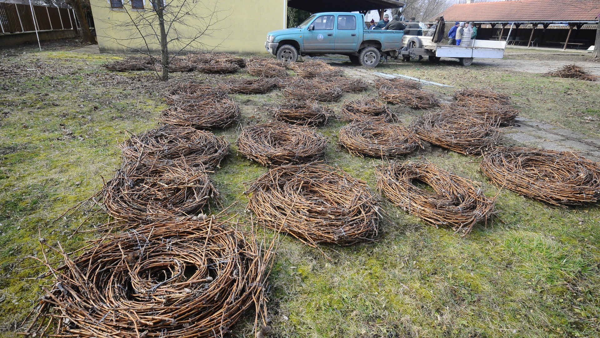 A fészeképítéshez szükséges fészekanyagot, mely valójában szőlővenyige, Tokaj-Hegyaljáról szerezték be munkatársaink, ezúton is köszönjük a felajánlást Bott Vince bodrogkeresztúri szőlősgazdának. Szép, napsütéses időben dolgoztunk a Tiszalúci Önkormányzat Holt-Tisza parti üdülőjének területén.